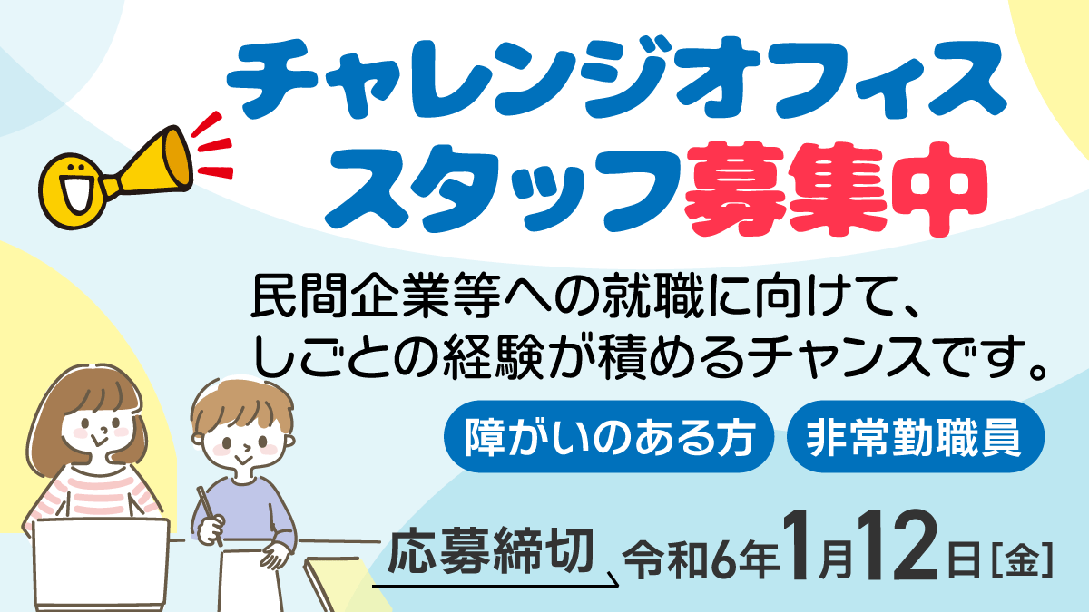 【チャレンジオフィススタッフ募集中】[対象]民間企業等への就職をめざす#障がいのある方[勤務場所]横浜(県庁)、横須賀・厚木・平塚・小田原の各合同庁舎のいずれか[仕事内容]文書集荷・発送、紙資料の電子..