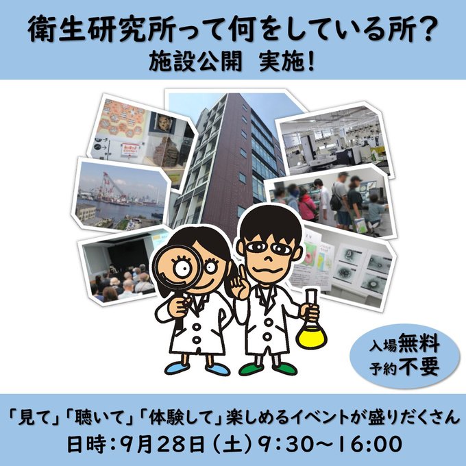 ┏━━━━━━━━━━━━┓衛生研究所は何をしている所?#施設公開実施します┗━━━━━━━━━━━━┛「見て」「聴いて」「体験して」、子どもから大人まで楽しめるイベント盛りだくさん!9/28(土)9..