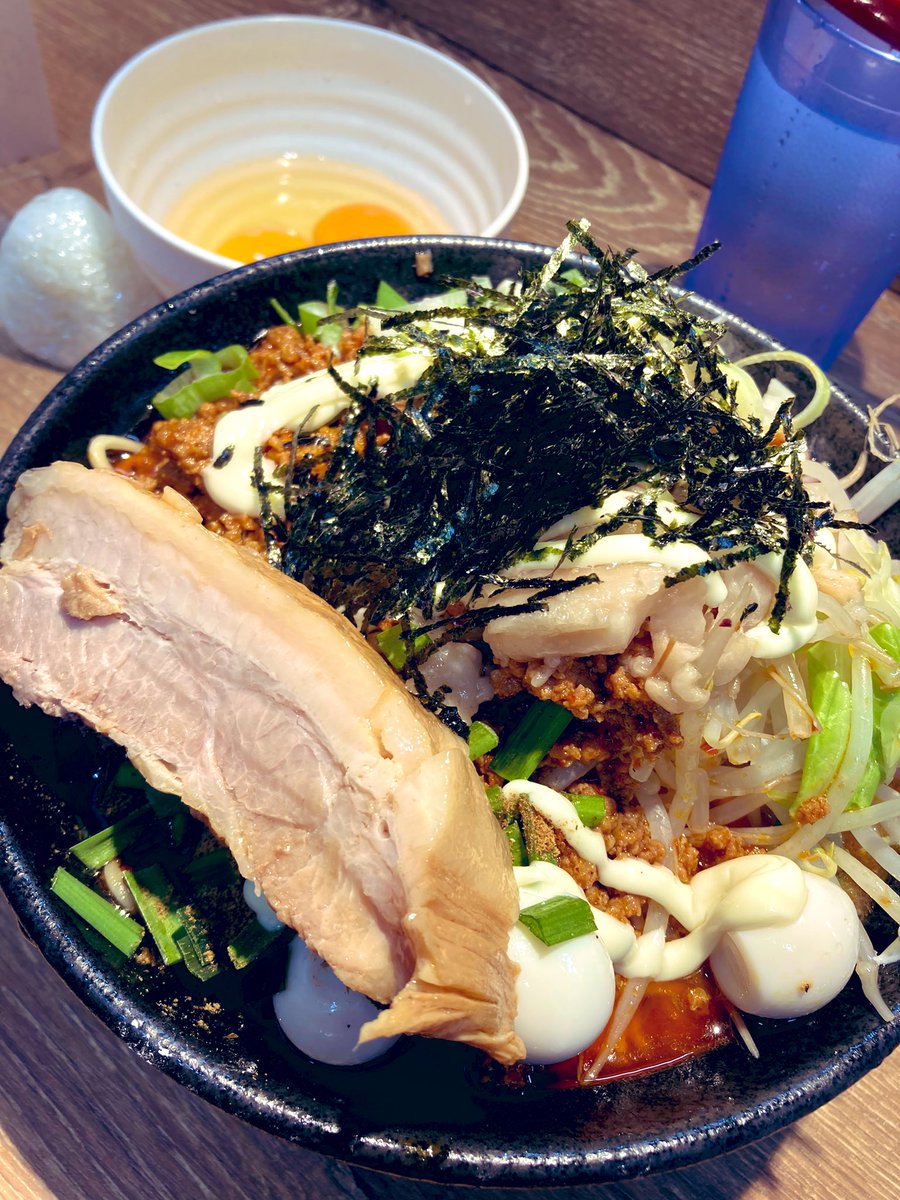 矢向にて、自家製麺浜一🍜3周年記念限定「~オマール海老~浜湾」汁なし40食限定パツパツ細麺350g+豚1枚+生卵✕2トッピング🍥 3周年おめでとうございます🎊並び50人以上の中、色々なフォロワーさん..