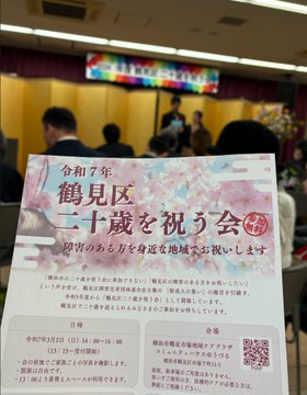 「鶴見区二十歳を祝う会」に参加しました。横浜アリーナで市が行う「二十歳の市民を祝う会」への参加が難しい障害のある若者を、身近な地域でお祝いする温かい祝宴ミニコンサートやお花・飲み物お菓子や記念品まで、..