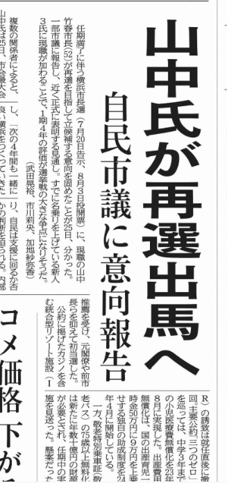 紙版1面の見出しが重要ね【自民市議に意向報告】しみんではなくじみんに皆んなでなく一部に#横浜市長選挙、山中竹春氏が再選出馬へ一部市議に意向を報告、近く表明:神奈川新聞https://kanaloco...