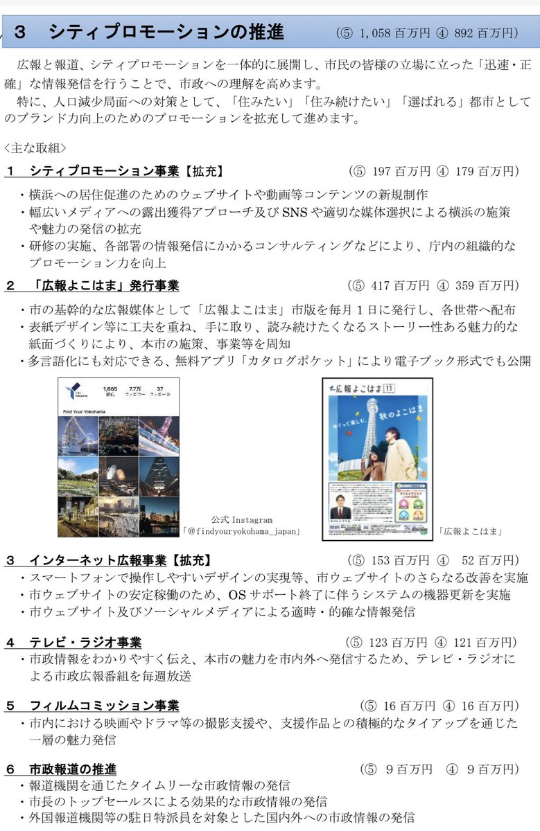 #よこはま予算5【政策局】 シティプロモーション事業に1億9700万円。文化観光局から一部所管も移動して「ヨコハマ」を発信する事業。ただ、Webサイト動画SNSへの発信止まりでは、ダメ。もっと踏み込ん..