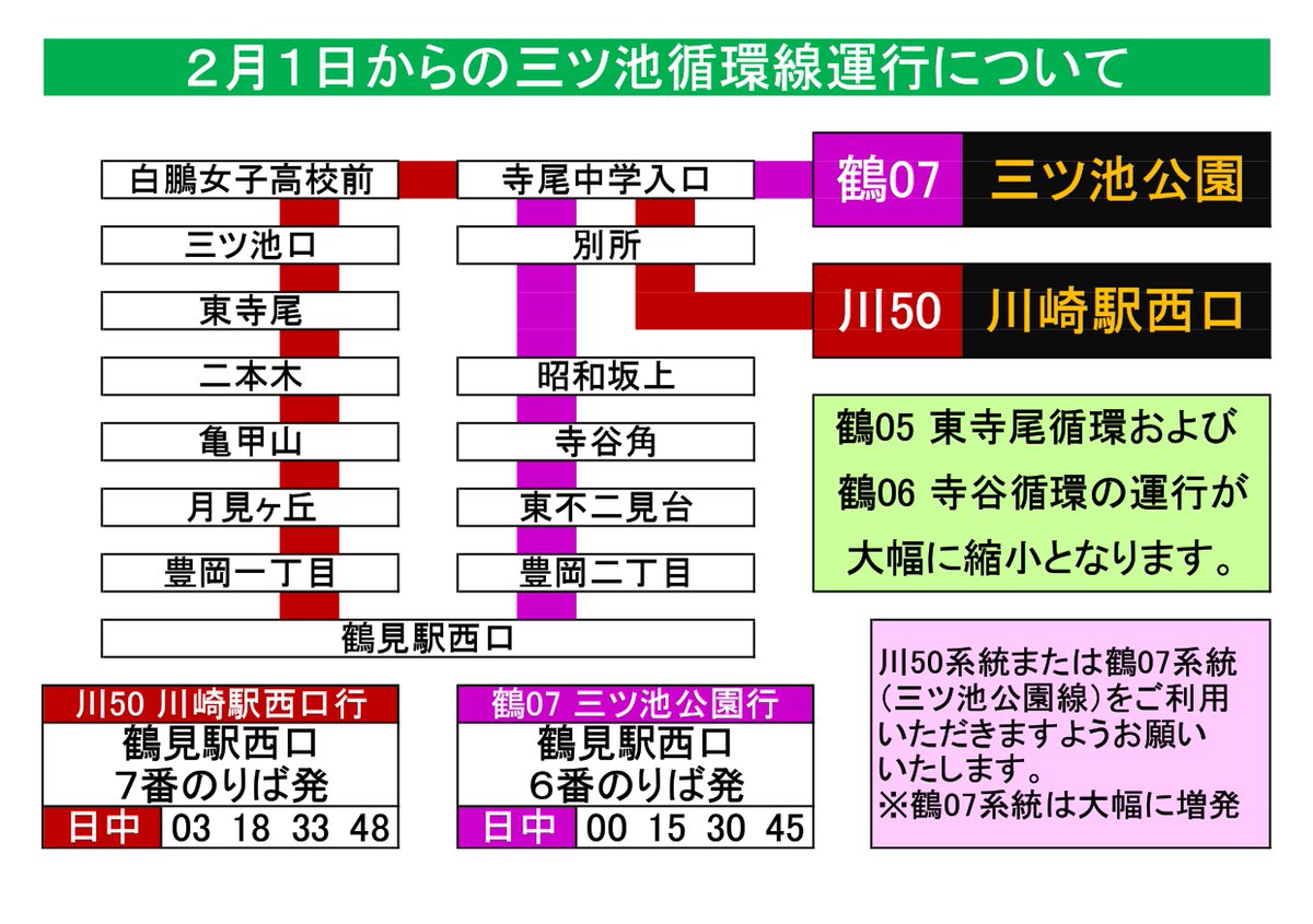 【ダイヤ改正のお知らせ】 鶴05・鶴06・鶴07・川50系統は、 2月1日にダイヤ改正を実施いたします。 平日ダイヤを中心に大幅な変更がありますので、 ホームページや停留所の時刻表をご確認のうえ、 ご利用をお願いいたします。 詳しくは▼