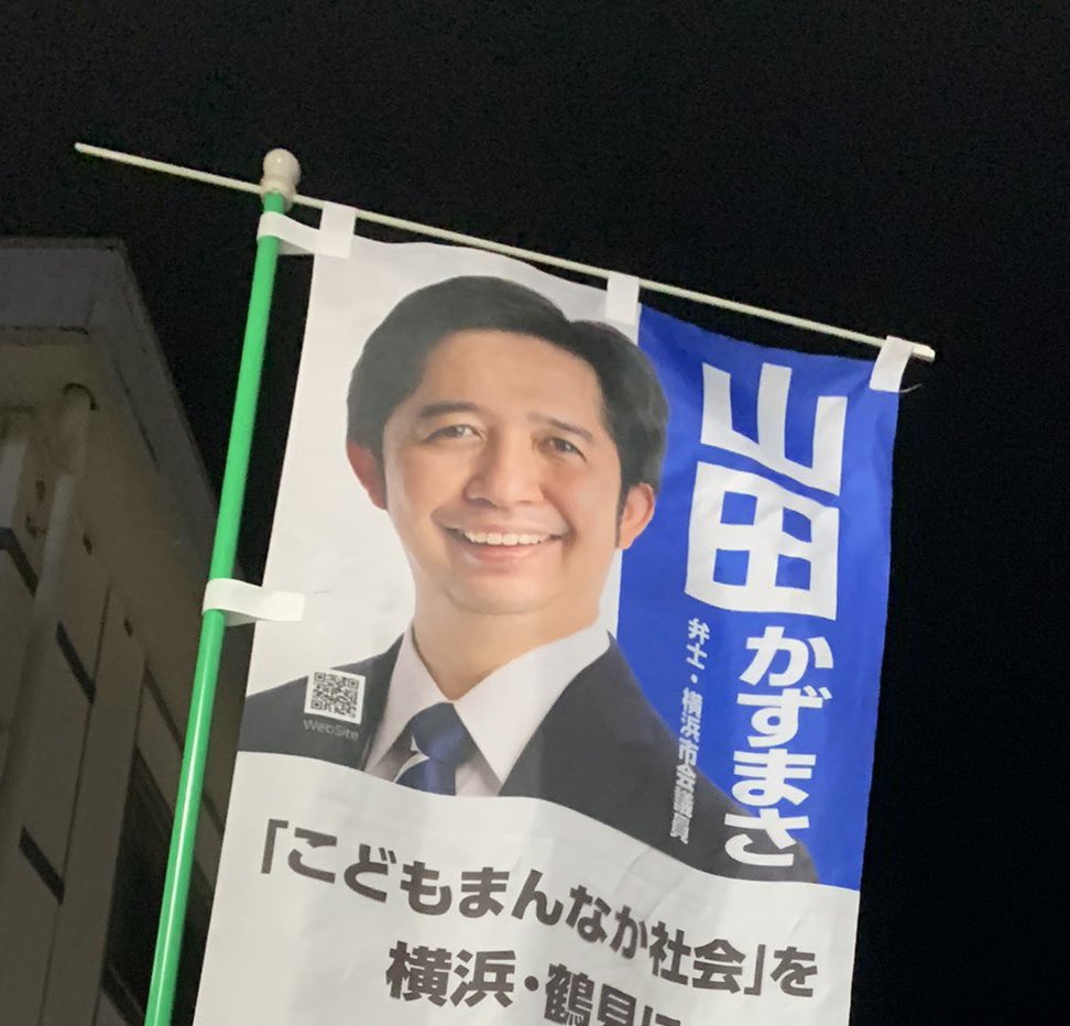 今朝の駅頭で、風に揺れるノボリが作り出した、自分の顔が、見れば見るほどジワジワきてやばい(笑)#山田か#横浜市会議員009