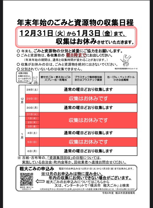 横浜市のごみ収集は12/31-1/3までおやすみです。ごみの多くなる時期ですが、分別のご協力をよろしくお願いいたします!詳しくはこちらから▼https://city.yokohama.lg.jp/ku..