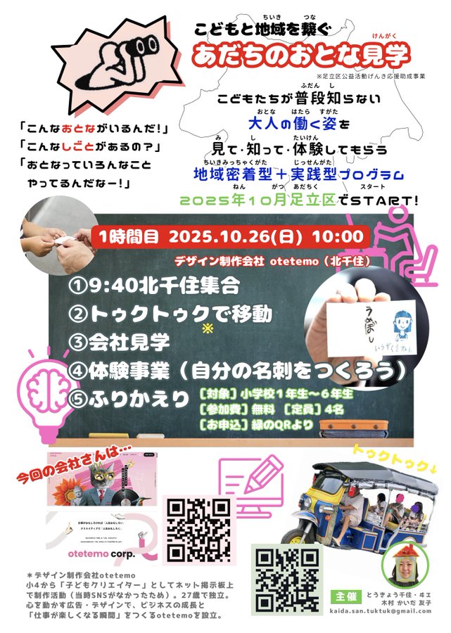 センター登録団体「とうきょう千住・ヰヱ」さんからのイベントのお知らせです‼︎ 〜こどもと地域を繋ぐ あだちのおとな見学〜 こどもたちたちが普段知らない大人の働く姿を知って・体験してもらう地域密着型+実践型プログラム 2025年10月足立区でSTART