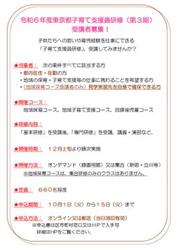 【#子育て支援員研修 のご案内】 #東京都 では、地域で保育や子育てをサポートする子育て支援員を養成しています。 保育所などで働いてみたい方、ぜひ受講をご検討ください!(申込期間:10/1~10/15) https://fukushi.metro.tokyo.lg.jp/kodomo//katei/kosodateshieninkensyuu01.html…