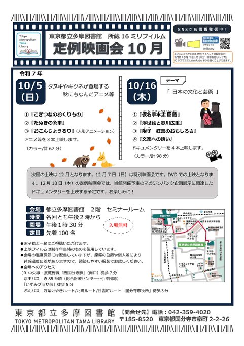 定例映画会@都立多摩図書館#都立多摩図書館では、16ミリフィルムによる#映画会を実施しています。10月16日(木)開催の第2回定例映画会では「日本の文化と芸術」をテーマとしたドキュメンタリーを4本上映..