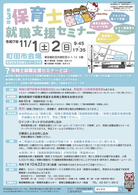 保育士就職支援セミナー【町田市会場11/1(土)2(日)】10/22(水)まで申込受付中現場で活かせる実践的なプログラムを講習と実技演習で学ぶことができ、ご希望の方は保育所での実習も可能です。「ブラン..