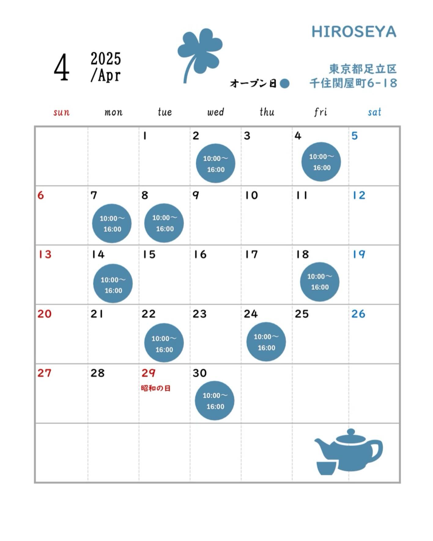 店舗営業日カレンダー〜4月〜週2日営業時間:10時〜16時今月も焼菓子、チョコレートを取り揃えてお待ちしています🌷🌷🌷〜〜〜〜〜〜〜〜〜〜〜〜〜〜〜〜〜〜〜〜HIROSEYA|チョコレートと焼菓子のお..