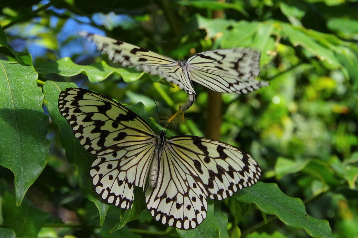 大温室で#オオゴマダラが求愛していました。オスの腹部先端からフェロモンを分泌するための黄色いヘアペンシルが見えています。天気が良い日は求愛の様子があちこちで見られるので、暖かい大温室の中で探してみては..