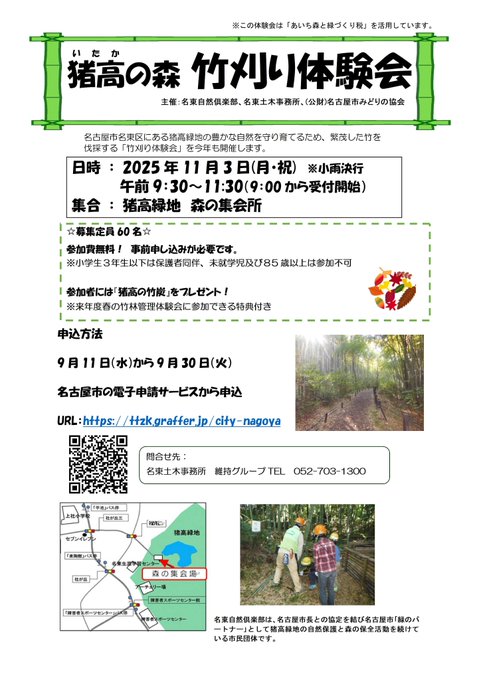 【猪高の森 竹刈り体験会 申込開始!】 増えすぎた竹を伐採する、緑地管理の体験会です。 参加者には、来年度春の竹林管理体験会(タケノコ掘り)に参加できる特典付き! ▼申込はこちら https://ttzk.graffer.jp/city-nagoya/proc-search/procedures/71a4fba1-5187-43d8-aab4-92840cb8ac41…