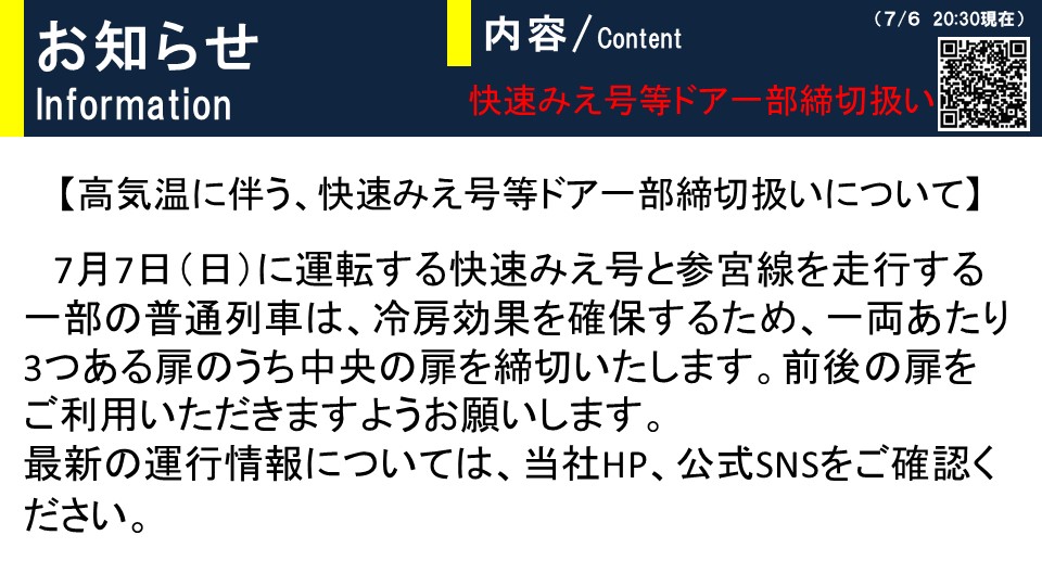 【07月06日20時50分現在】 【7月7日 快速みえ号等ドア一部締切扱いについて】 7月7日(日)に運転する快速みえ号と参宮線を走行する一部の普通列車は、冷房効果を確保するため、一両あたり3つある扉のうち中央の扉を締切いたします。前後の扉をご利用いただきますようお願いします。