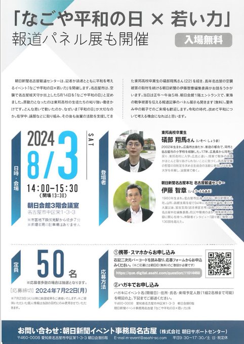 朝日新聞名古屋報道センターは8月3日(土)午後2時から、読者と平和を考えるイベント「なごや平和の日×若い力」を開きます。定員は50人です。ご応募お待ちしています。「なごや平和の日×若い力」講演・報道展..