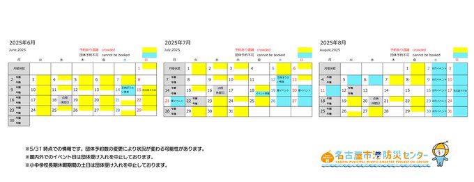 2025年6月から8月までの混雑状況カレンダーです 事前に空き状況をお電話にてお尋ねください。 ☆10名以上でのご来館は団体予約をお願いしております。 最新情報はHPへ https://minato-bousai.jp