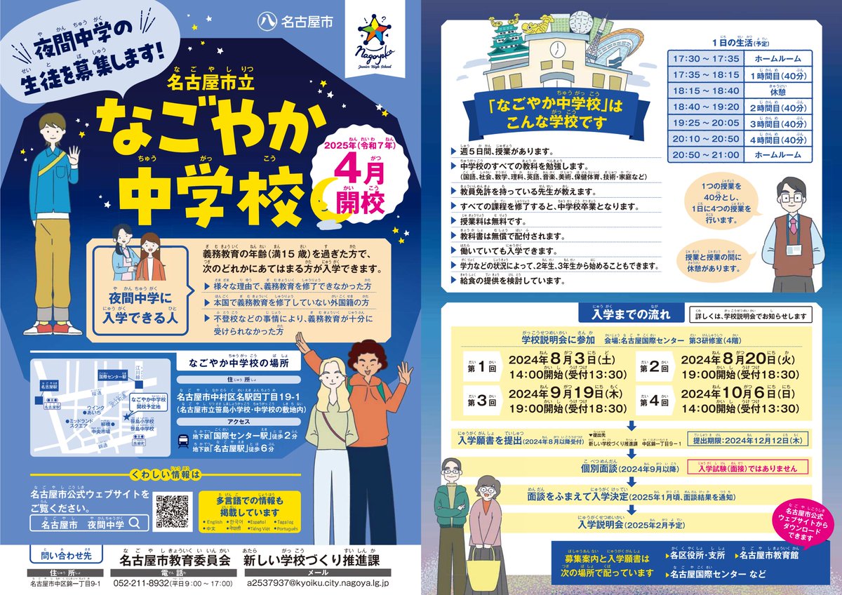市立なごやか中学校(夜間中学)は、本国や日本で義務教育を修了していない外国籍の方も入学できます!多言語の入学願書を掲載しました(英語、韓国語、スペイン語、タガログ語、中国語、ネパール語、ベトナム語、ポ..