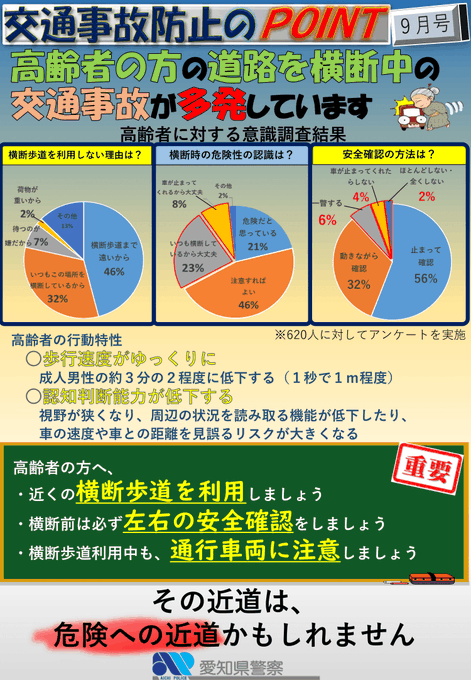【地域力推進課】高齢者の方の道路横断中の交通事故が多発しています。高齢者の方は特に、近くの横断歩道を利用すること、横断前に必ず左右の安全確認をすること、横断歩道利用中も通行車両に注意することを心がけま..