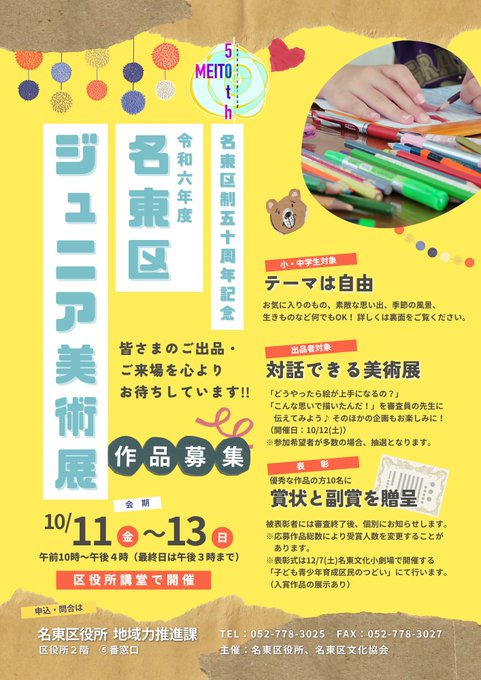 【締切延長!#名東区制50周年記念名東区ジュニア美術展作品募集】区内在住・在学の小・中学生が描いた絵画を募集中です!応募期間は9月18日(水)まで。夏の思い出を描いて『対話できる美術展』に参加しようお..