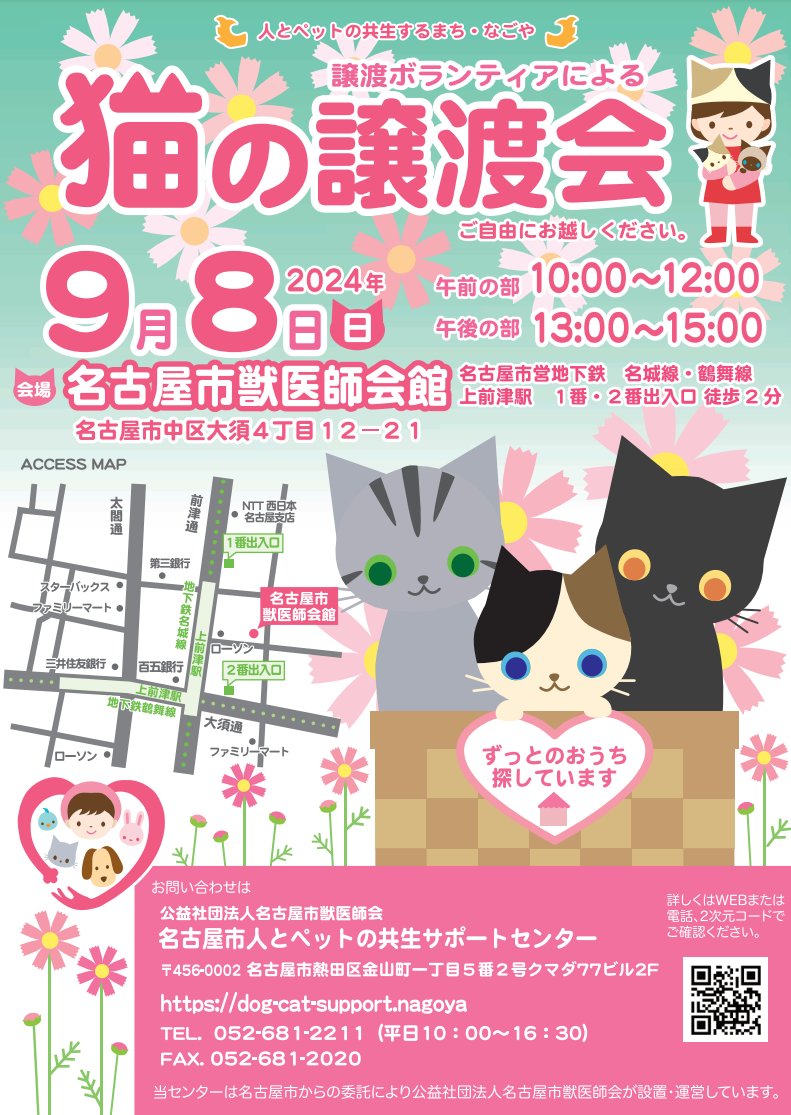 9/8㈰は名古屋市譲渡ボランティアによる「猫の譲渡会」を開催します!午前午後の2部制・入場無料・自由来場制です。時間:10:00~12:00/13:00~15:00会場:名古屋市獣医師会館(駐車場なし..