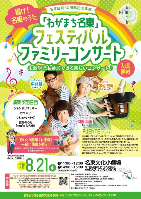 【イベント情報】 本日、名東文化小劇場にて「名東区制50周年記念事業『わがまち名東』フェスティバルファミリーコンサート」を開催します! 午後の部のみ、当日受付を行います!未就学児も参加できる楽しいコンサートです是非お越しください♪