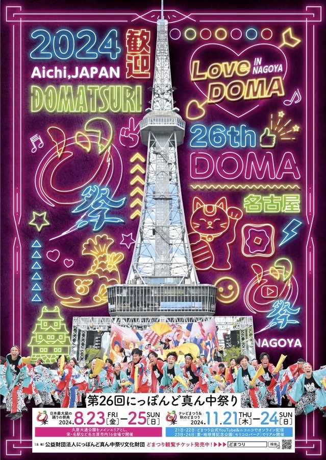 真夏の名古屋を舞台に全16会場で繰り広げる日本最大級のにっぽんど真ん中祭り(どまつり)!感動!興奮!熱気あふれる踊りの祭典地域豊かな踊りをぜひ会場で楽しもう!https://domatsuri.com..
