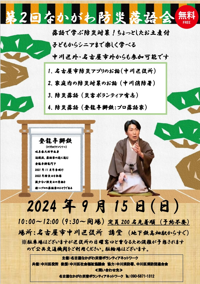 【総務課】9月15日(日)10時から中川区役所講堂にて「第2回なかがわ防災落語会」が開催されます。プロの落語家による落語を聞きながら、楽しく防災について学ぶことができます。当日は、区役所の日曜窓口と重..
