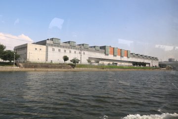 ささしまライブ24地区から名古屋港・金城ふ頭まで中川運河を航行する「#クルーズ名古屋」運河と名古屋港との水位を調整する中川口通船門の手前にあるこの建物、何の工場かご存じですか??