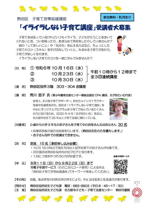 【熱田区子育て世帯応援講座】「イライラしない子育て講座」を10月16日・23日・30日の計3回、熱田区役所で開催します!ちょっとした子育てのコツを一緒に学んで楽しく子育てしませんか?託児もありますので..