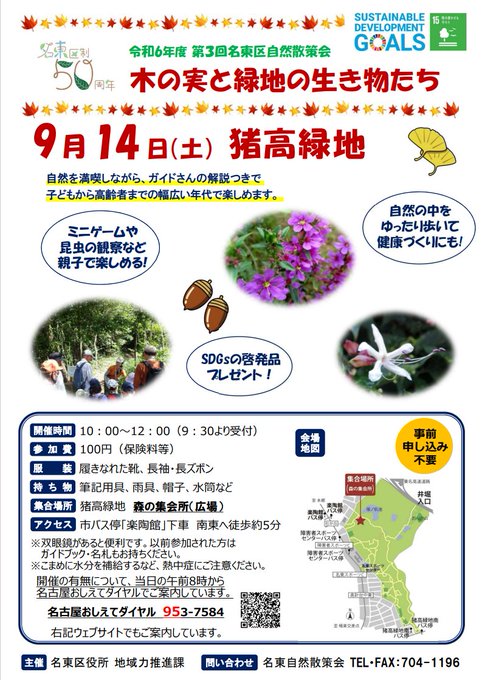 【名東区制50周年記念:第3回名東区自然散策会を開催!】9月14日(土)に猪高緑地で自然散策会を開催します。鮮やかに色づいた木の実や葉を探して、秋の訪れを感じてみませんか。ガイドさんの解説つきで、子ど..