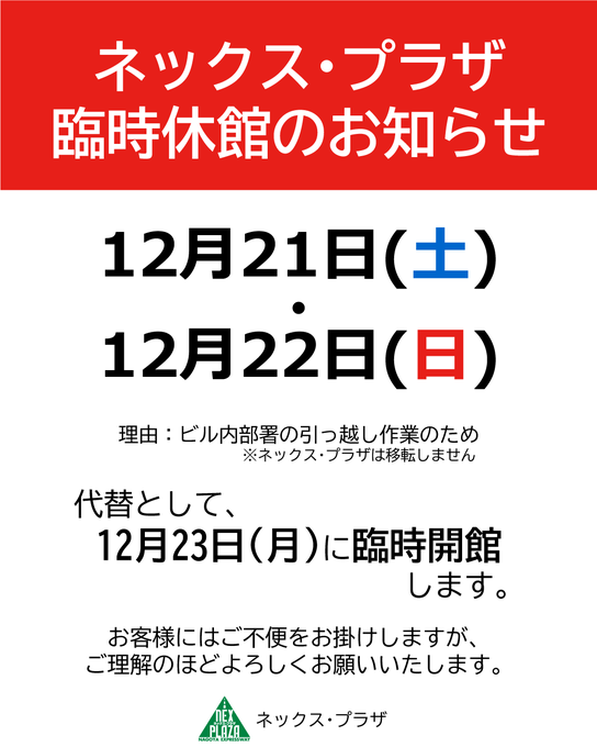 #ネックス・プラザは、名古屋高速道路公社の一部部署の移転に伴う引っ越し作業のため、明日12月21日(土)と明後日22日(日)は臨時休館します。代替として、23日(月)に臨時開館します。ご不便をおかけし..