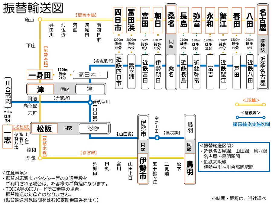 【振替輸送について】12時50分よりJR線から近鉄線への振替輸送を実施します。ご利用のお客様は添付「振替輸送のご案内」をご確認のうえ、ご乗車ください。※IC定期券は改札機へタッチせず改札口でご提示くだ..