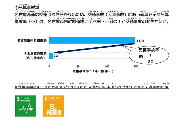 【名古屋高速でSDGsを学ぼう④】名古屋高速で人身事故に遭う確率は、名古屋市内幹線道路の約20分の1です。一般道よりも安全に走行いただけます。#ネックス・プラザでは、名古屋高速と#SDGsについて1時..