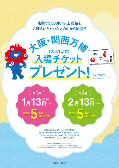 【2025大阪・関西万博オフィシャルストアより】1/13(月)よりオフィシャルグッズを税込3,300円以上ご購入いただいた方の中から抽選で5名様に、大阪・関西万博入場チケット(大人1日券)をプレゼント..