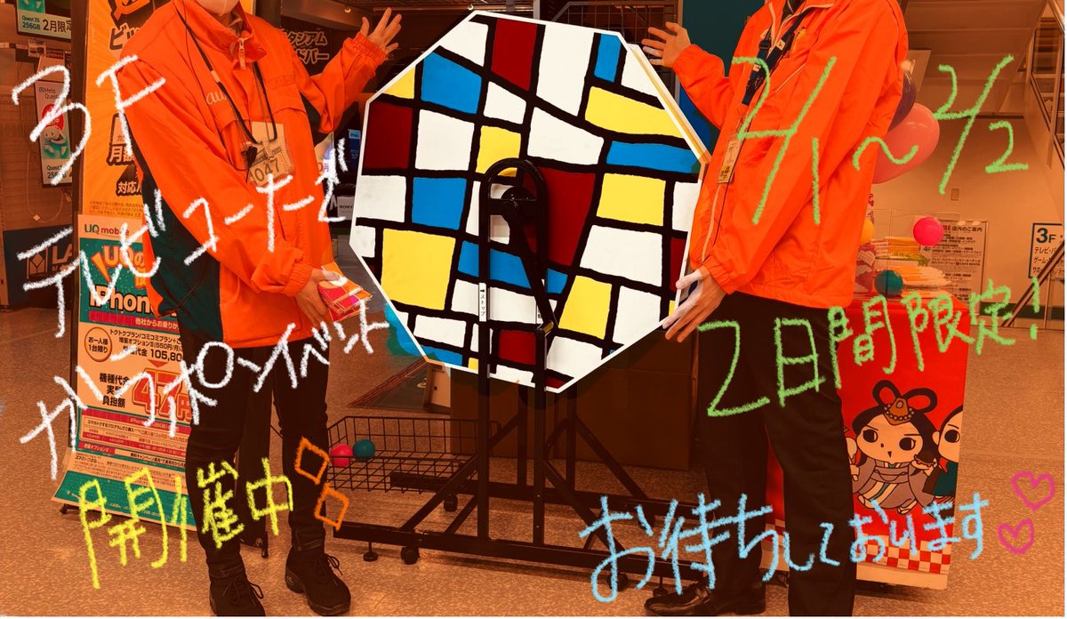\au・UQmobileです/2月最初の大チャンス2/2(土)~2/2(日)の2日間、3階テレビコーナー付近にてガラポンイベントを開催中!アンケートに答えるだけでノベルティゲットここだけの話…おトクな..