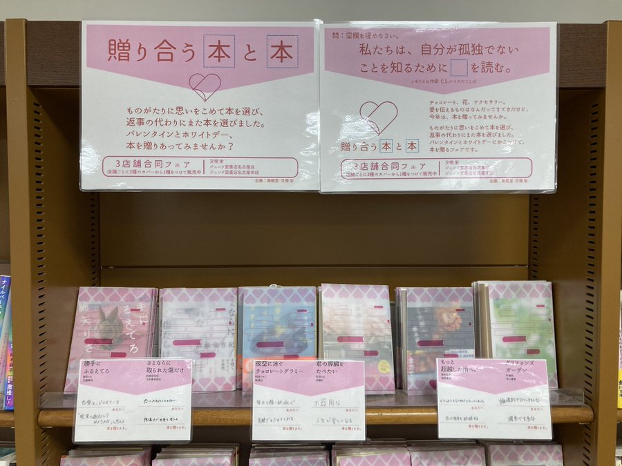 「#贈り合う本と本」フェア#ジュンク堂書店名古屋店、栄店、#文喫栄の3店舗かフェア対象の本にそれぞれ別のデザインのブックカバーをかけて販売しております#バレンタイン、#ホワイトデーにを贈り合うように、..