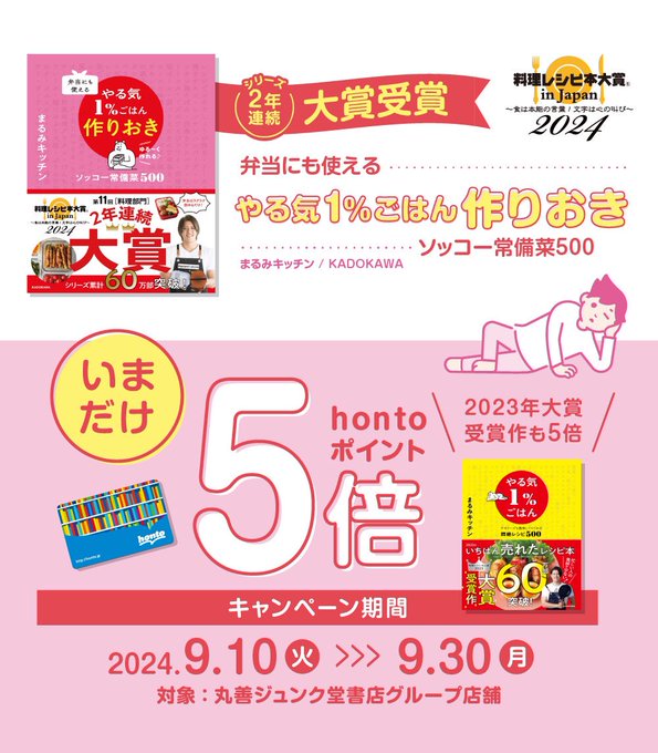 大賞決定#料理レシピ本大賞inJapan2024【大賞】まるみキッチン著『弁当にも使えるやる気1%ごはん作りおきソッコー常備菜500』(KADOKAWA)9/30までの期間、大賞受賞作および2023年..