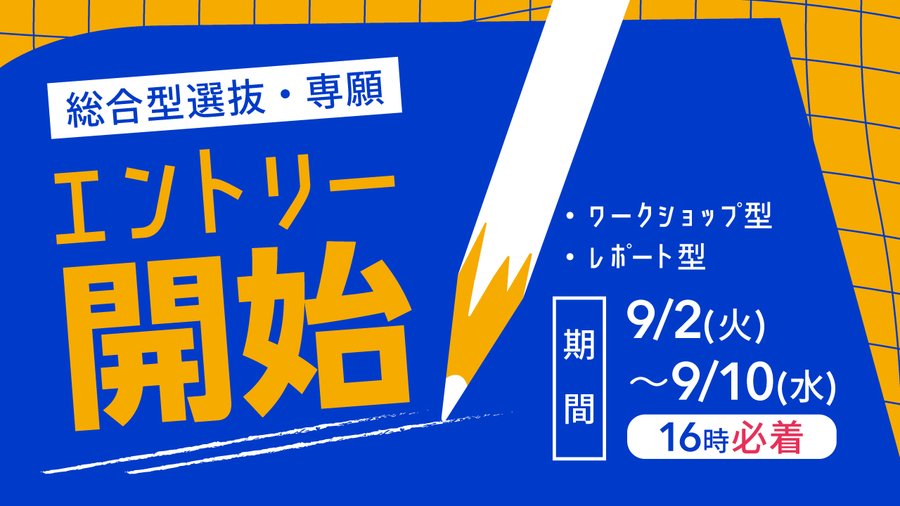 「総合型選抜・専願」エントリーが開始しています エントリーの際は書類や注意事項をよく確認して準備をしてください エントリー期間 9月2日(火)〜9月10日(水)16時必着 Webサイトでエントリーの流れなどを紹介中! ▼リプライ欄に記載▼
