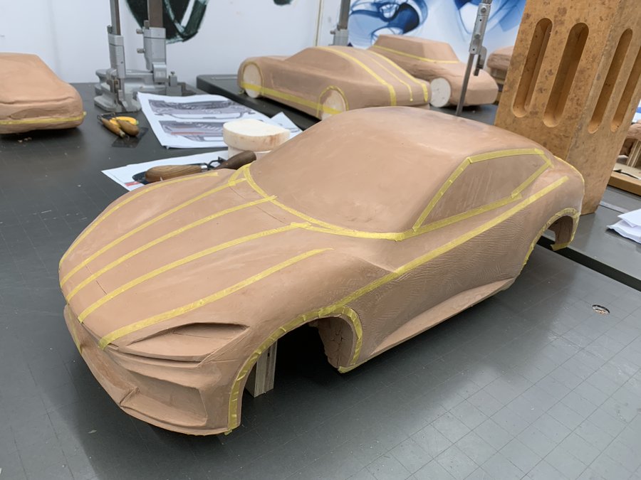 制作中のクレイモデルを紹介!カーデザイン学科では、学生が自分のスケッチから本格的な立体モデルを制作実車をベースに専用粘土で造形する工程は、まさにプロの現場そのもの!立体感覚と技術が身につき、就職活動に..