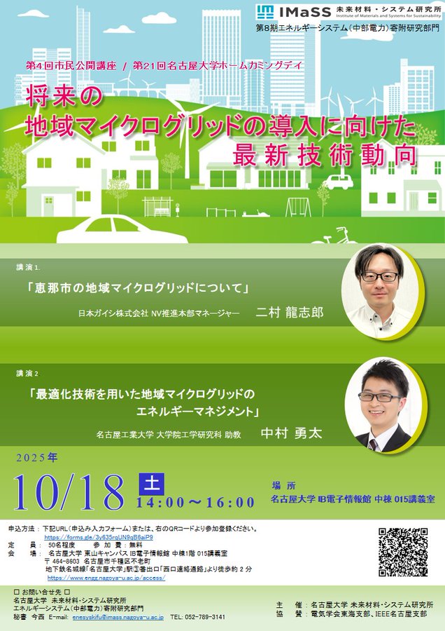 ☆イベント情報☆第4回市民公開講座(10/2〆切)「将来のモビリティ社会に向けた最新技術動向」(第21回名古屋大学ホームカミングデイ)日時:2025年10月18日(土)14:00ー16:00場所:東山..