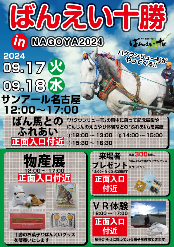 ★ばんえい十勝inNAGOYA2024(協力:帯広市)~ばん馬がサンアール名古屋にやってくる!~9月17(火)、18日(水)#ばんえい十勝inNAGOYA2024の開催が決定しました詳細はHPイベント..