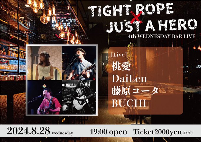 【本日の公演】8月28日(水)"TIGHTROPE×JUSTAHERO4thWednesdayBARLIVE"[ACT]桃愛/DaiLen/藤原コータ/BUCHI19:00openLIVECHARGE..