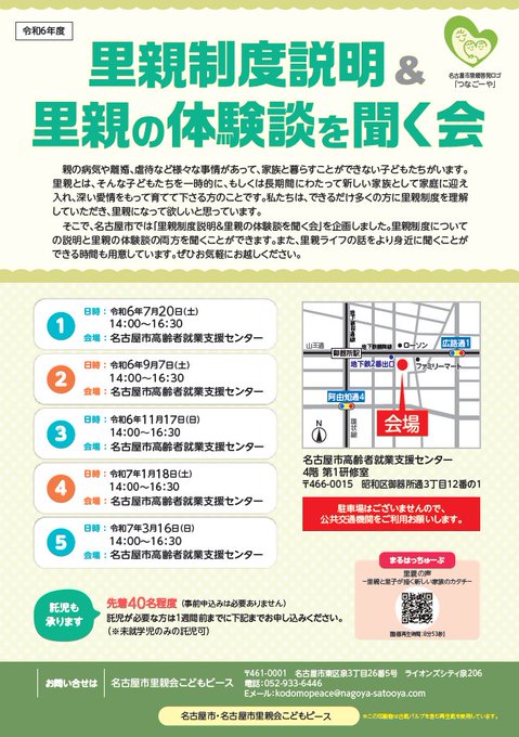 里親制度説明&里親の体験談を聞く会9/7(土)14:00~16:30@高齢者就業支援センター(御器所)児童相談所職員による制度説明と#里親さんの体験談を聞くことができます!予約不要なのでお気軽にご参加..