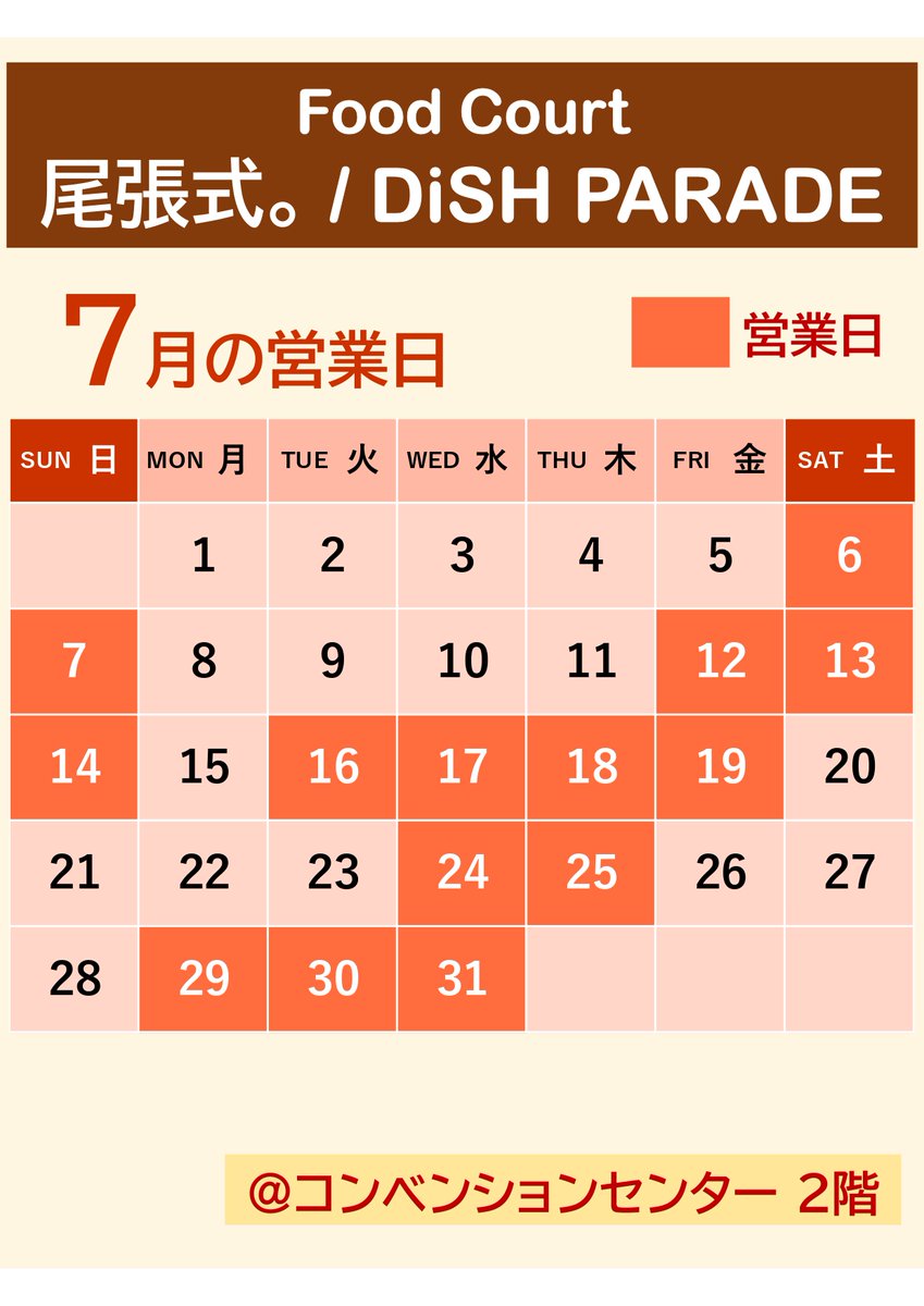 【飲食店舗の営業予定】7月のフードコートの営業予定です。本日も営業しておりますので、ぜひランチタイムにお越しください!#DiSHPARADE#尾張式。#なごやめし#ポートメッセなごや#フードコート