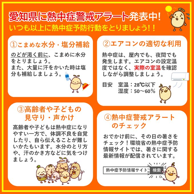 今年の夏は平年より暑くなる見込みだよ 今週末は岡崎の花火大会だね! たくさんの楽しいイベントがある夏休みだけど、 連日、愛知県に熱中症警戒アラートが発表されているよ 熱中症警戒アラートは、熱中症の危険性がとても高い時に発表されるよ! より一層熱中症に気をつけよう