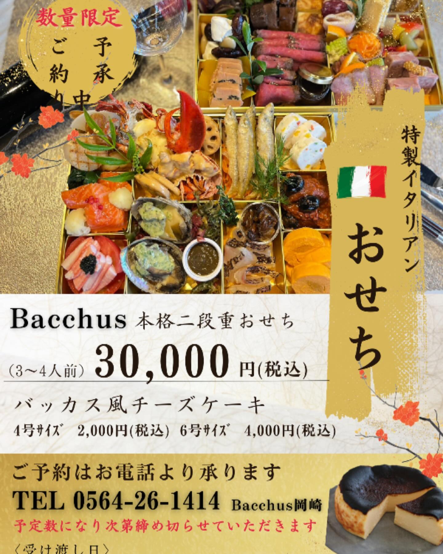 2024年12月30日限定Bacchus特製イタリアンおせちを今年も販売致します。3〜4人前でいただける内容となっております。和風とは違う洋風おせちで、新年を是非お楽しみ下さい。ご予約お待ちしておりま..