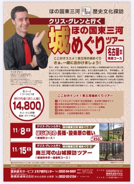 今年もやりますクリス・グレンさんの「東三河城めぐりツアー」② 今年は名古屋発着の2コース。11月15日(土)は、『奥三河の山城めぐり』コース。詳細お申込はこちらから https://mei-rakuraku.jp/toyotetsukankobus/BTCS/Tour/Detail?course=1149… #城好き #城攻め #城めぐり #城郭 #クリスグレン