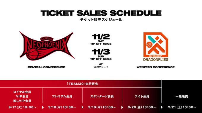 【チケット情報】 本日9/19(木)18時より、ブースタークラブ #TEAM30 スタンダード会員さまを対象とした、下記観戦チケットの先行販売がスタート 会場で #三遠ネオフェニックス へ熱い応援をよろしくお願いします <対象試合> 11月2日(土)、3日(日)15:05 TIPOFF #浜松アリーナ