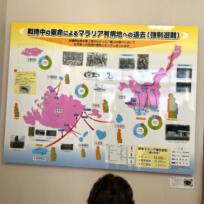 ピンクの所はマラリアの有病地帯日本軍はこの地図を持っていたので、どこが有病地帯かを把握していた。無病地帯にいた人たちも、そこに行けばマラリアに罹ってしまうとわかっていたが、軍には逆らえなかった。「戦争..