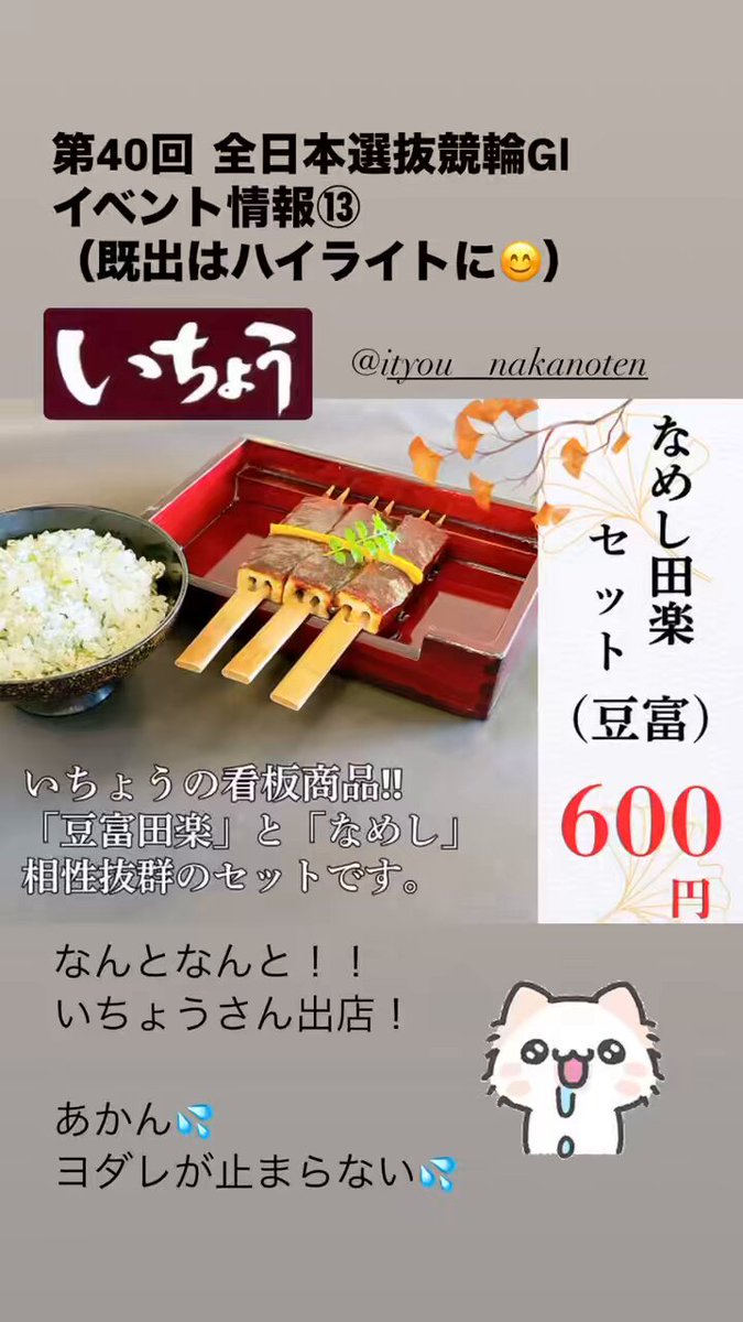 全日本選抜競輪GⅠ豊橋競輪場イベント情報を少しずつアップしていきますInstagramのハイライトにも残していきますので、そちらもチェック開催中毎日、豊橋名物なめし田楽で有名な、いちょうさん出店いただ..