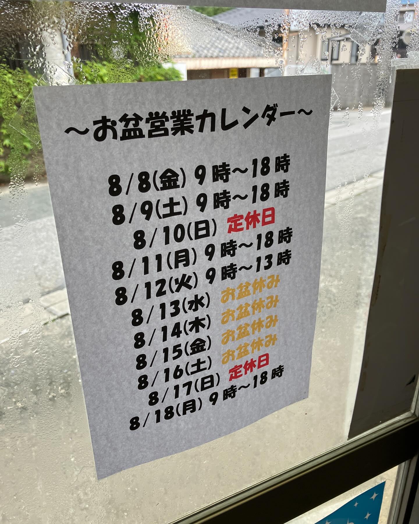 【お盆の営業日】こんにちは。お盆期間は8月10日(日)から16日(土)まで休まず営業致します。10日は本来定休日ですが臨時で17:00まで営業致します。お盆明けの17日18日19日はお休みさせて頂きま..